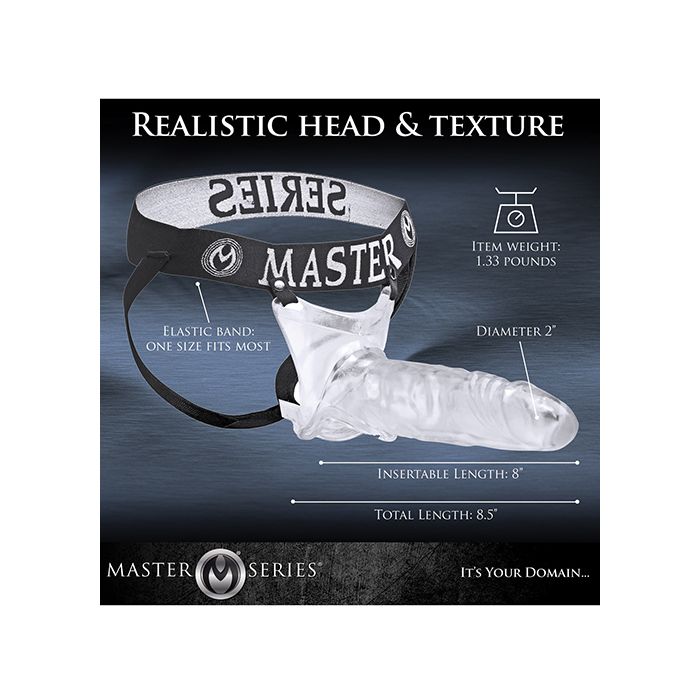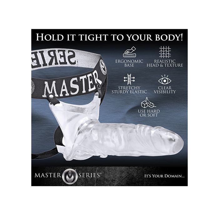 This clear extender adds length, girth, and hardness while allowing you to show through. The elastic waist and ergonomic base hold it tight to your body as the realistic head and textured shaft penetrates your partner.