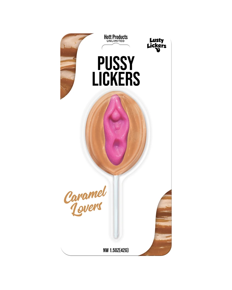 Caramel Lovers pussy-shaped hard candy on a stick.