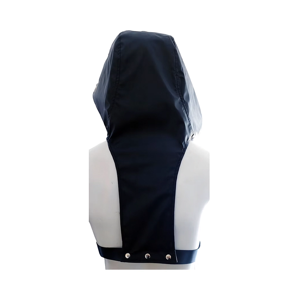 This Faux Leather Hoodie Harness with a Leather Strap is one size with multiple snap buttons around the strap for adjustable sizing.